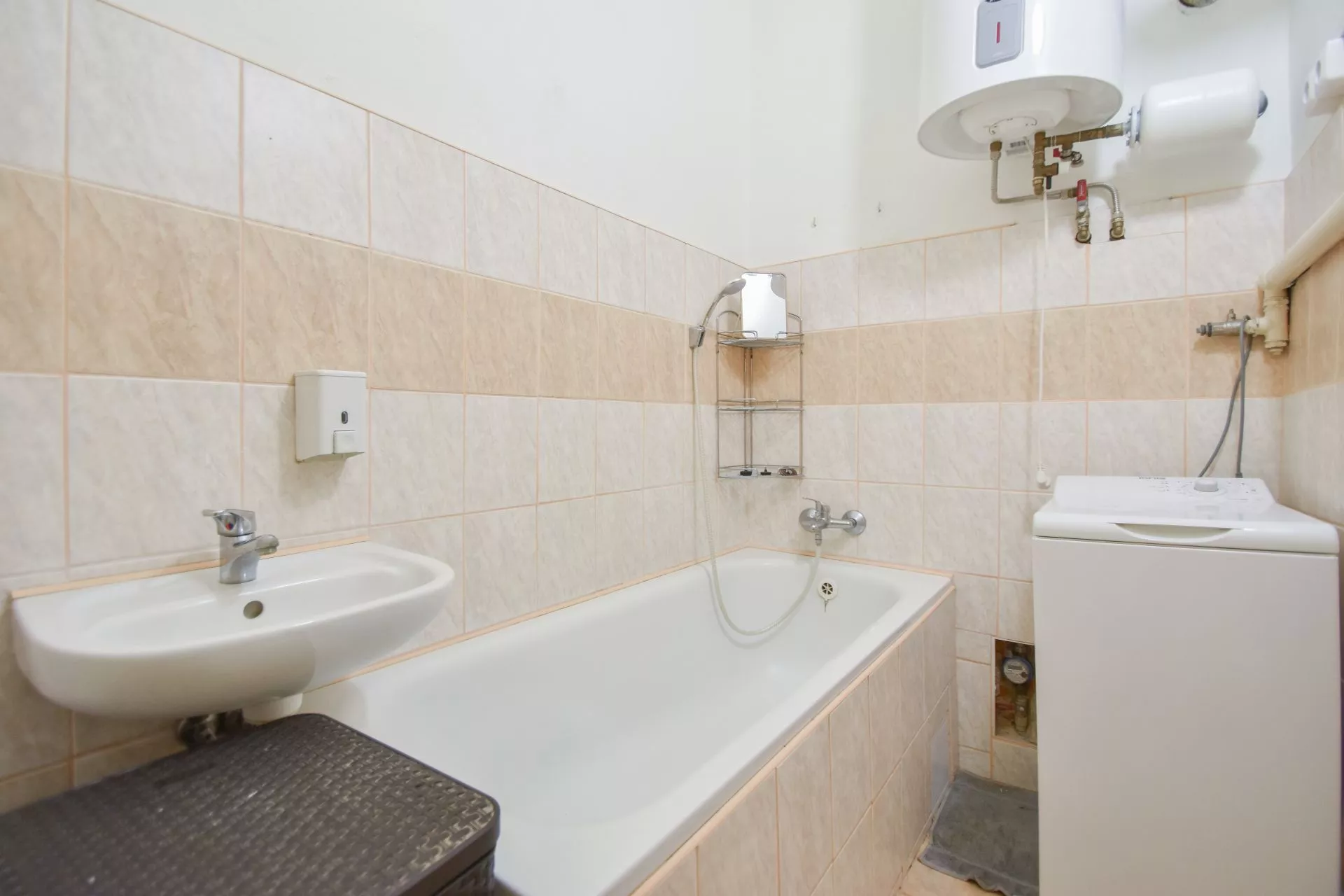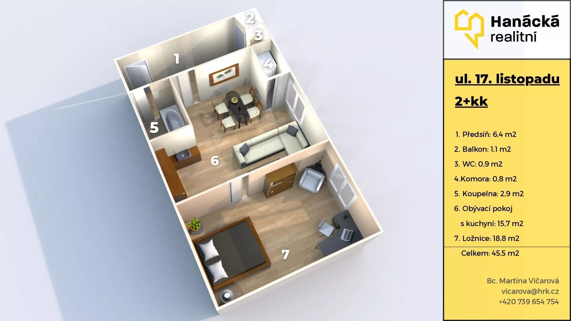 Byt má výbornou dispozici. Z prostorné předsíně se vchází do obývacího pokoje s kuchyňským koutem a dále se vchází do samostatné ložnice. Koupelna je s vanou a toaleta samostatná. Výměra bytu činí 45,5 m2. Celkové náklady jsou také přiznivé, jejich součet činí 2.630 Kč + elektřina a plyn.
